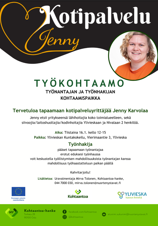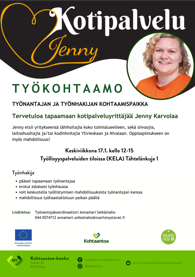 Kotipalvelu Jenny on ostanut 23.5.2022 Siivouspalvelu Mustapään liiketoiminnan Haapavedellä. Kotipalvelu Jenny tarjoaa vanhoille ja uusille asiakkaille jatkossakin laadukasta ja asiakkaan tarpeista lähtevää kotipalvelua sekä siivouspalveluja yksityisille ja yrityksille Haapavedellä ja sen lähikunnissa. Katso uutinen TÄSTÄ.